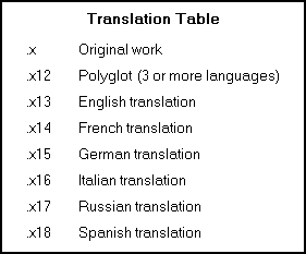 If the number one (1) was omitted from the number representing the translation (e.g., .x for the original work, .x3 for an English translation, .x4 for French, .x5 for German, etc.), continue this practice only when the pattern has already been established for that work. Use the Translation Table without the number one (1).